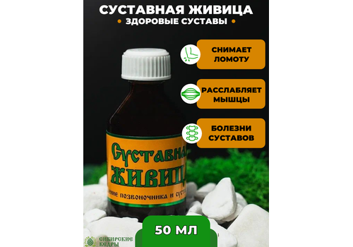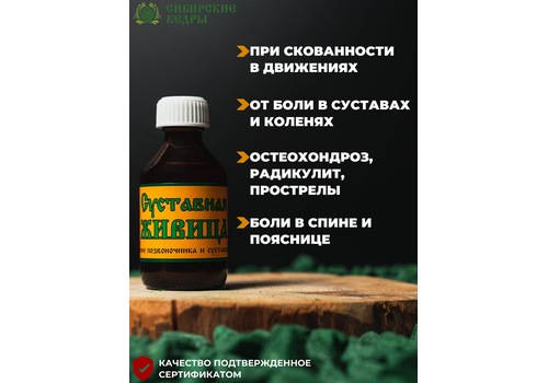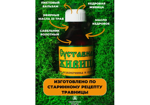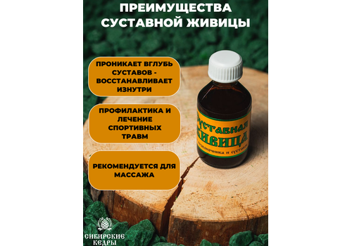 Свойства: суставная живица разработана специально для восстановления суставов и позвоночника. Её эффективно применяют для заживления ран и ожогов, при грибковых поражениях кожи, шпорах, варикозном расширении вен, пролежнях. Живицу суставную с успехом используют для массажа. Данный бальзам благотворно влияет на опорно-двигательный аппарат, мышечную и суставную невралгию, является обезболивающим и исцеляющим средством. Сабельник болотный в сочетании с живицей оказывает противовоспалительное и обезболивающее воздействие, а масляная основа, обладая проникающим свойством, доставит исцеляющие соединения к поврежденным участкам. Комплекс эфирных масел имеет сильный терапевтический эффект, воздействуя на рецепторы обоняния, усиливая и закрепляя исцеляющее воздействие бальзама.