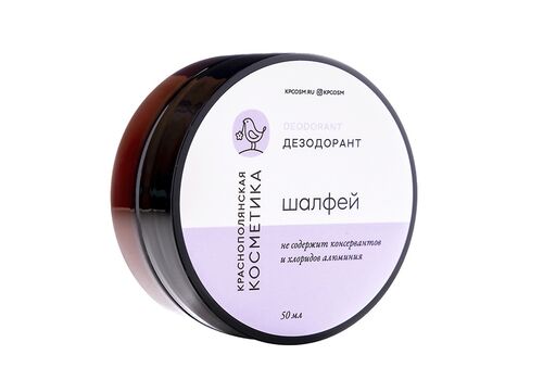 Натуральные дезодоранты «Краснополянской косметики» изготовлены вручную. Основные компоненты здесь — это травы и природные масла. Натуральный дезодорант «Шалфей» питает и защищает кожу, обладая ненавязчивым ароматом грейпфрута и шалфея.