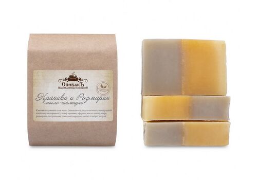 Мыло-шампунь "Крапива и Розмарин" с приятным травяным ароматом сварено на отваре крапивы. Эфирные масла розмарина, пихты, цитронеллы способствуют укреплению волос, нормализации работы сальных желез и достаточно эффективны против перхоти.