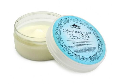 Скраб для тела La Belle -- насыщенный, манящий, сладкий аромат с нотками камфоры и цитруса! Морская соль содержит комплекс микро- (бром, фтор, железо, медь, селен и др.) и макроэлементов (натрий, кальций, магний, калий, марганец, йод и др.), является мягкоабразивным средством, поэтому очищает и отшелушивает кожу, не травмируя ее. Повышает упругость и эластичность кожи, улучшает кровообращение, ускоряет регенерацию и восстановление, уменьшает раздражения, борется с целлюлитом. Эфирное масло лавра камфорного придает коже упругость и эластичность, обладает омолаживающими свойствами, успокаивает, очищает, оказывает защитное действие, снимает покраснения и раздражения. Эфирное масло лимона испанского дает легкий отбеливающий эффект, смягчает и тонизирует кожу, ускоряет восстановление эпидермиса и способствует общему улучшению состояния кожи.