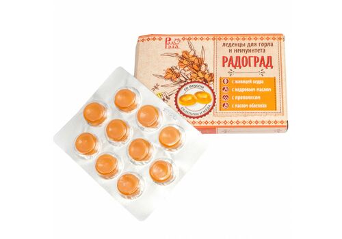 Живичные леденцы «Радоград» с облепихой и мёдом имеют в составе исключительно натуральные ингредиенты: живицу кедра, кедровое масло, прополис, облепиховое масло, витамин С. Они помогут справиться с первыми признаками простуды, поддержат иммунитет, устранят боль и першение в горле.